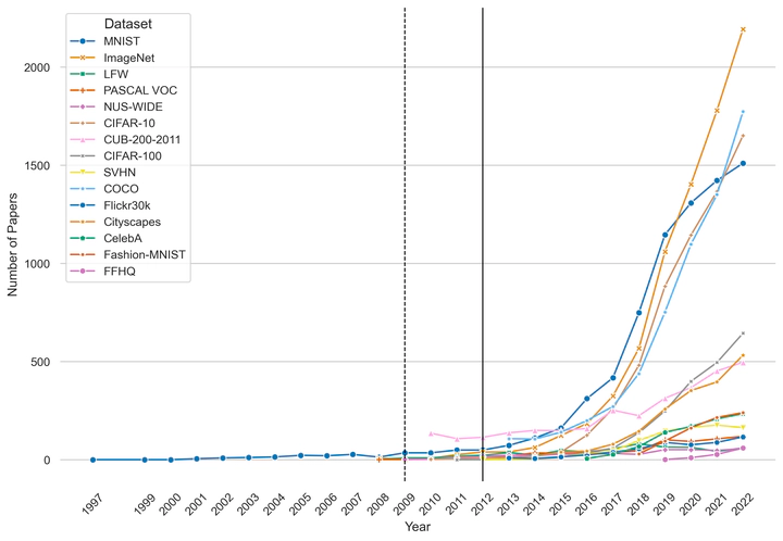Annual growth in the number of publications referencing the 15 most commonly used annotated image datasets.Abstract